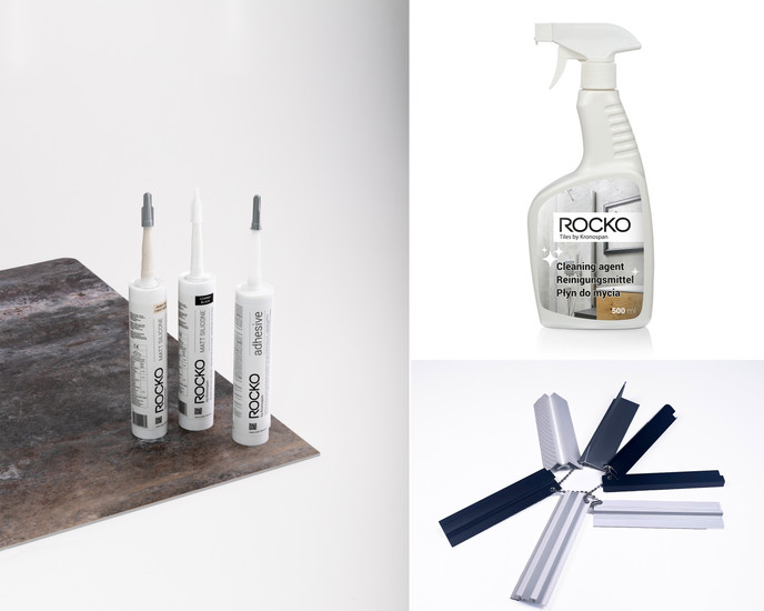 Adeziv și silicon – Fixare puternică și durabilă pentru plăcile Rocko Tiles. Siliconul de etanșare completează perfect spațiile dintre plăci, protejând împotriva umezelii și asigurând un finisaj uniform.